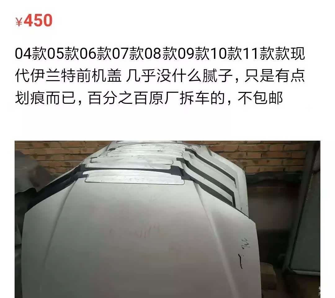 由于引擎盖制作工艺复杂,冲压等设备昂贵,所以一般的小厂并不会轻易制造低成本仿制品,导致某宝上几乎没有货源。转战某鱼发现,有些划痕的引擎盖都能卖到450元,按照我家伊兰特的成色,卖个500元问题不大。