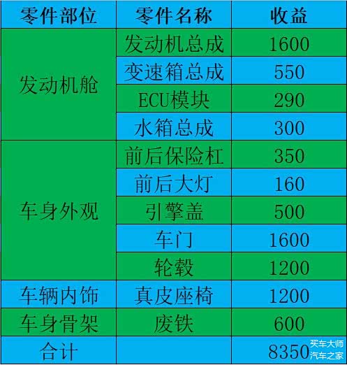 说了这么多,这辆老伊兰特也被我们拆得差不多了,最后来总结看看上面这些零件一共能卖多少钱?