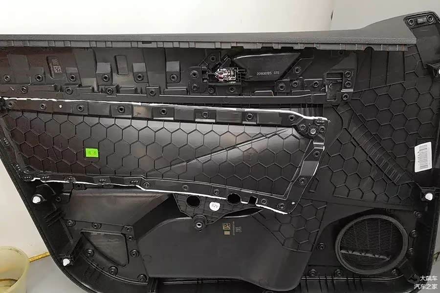 至于车门内饰板上隔音棉,很显然也是大众风格,光秃秃的一块塑料板,什么都没有。