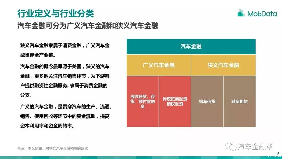 汽车金融是汽车行业和金融行业结合产生的新行业,广义上指所有和汽车相关的金融服务行业,狭义上汽车金融指汽车交易过程中需要的金融支持服务,我们通常所说的汽车金融一般为狭义的汽车金融概念,细分为汽车贷款(含汽车消费贷款、汽车抵押贷款)、汽车融资租赁(即以租代购)等两大类;