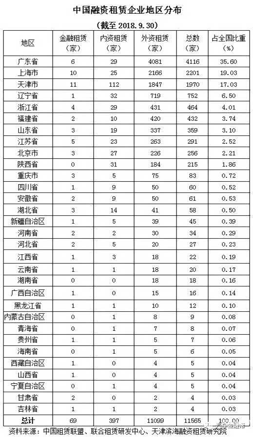 截至2018年9月底,全国融资租赁企业(不含单一项目公司、分公司、SPV公司和收购海外的公司)总数约为11565家,较上年底的9676家增加了1889家,增长19.5%。