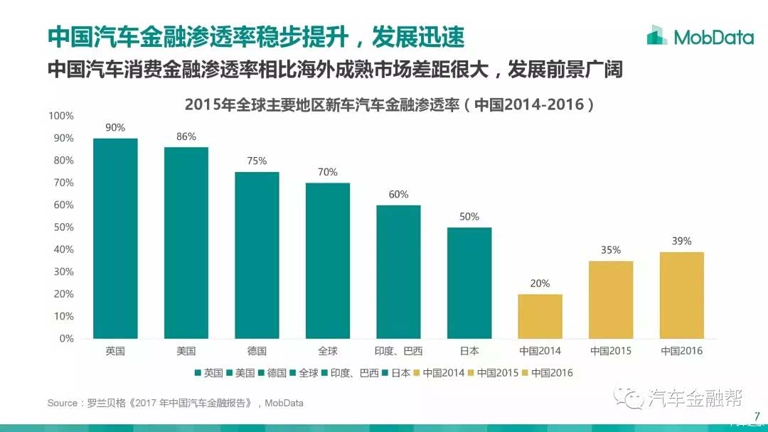 其次中国汽车消费金融渗透率相比海外成熟市场差距很大。汽车金融的渗透率,指通过贷款、融资等金融方式购买的车辆数量与汽车销量之比。