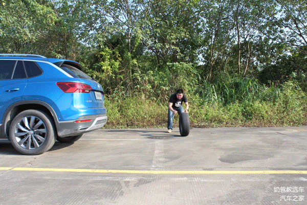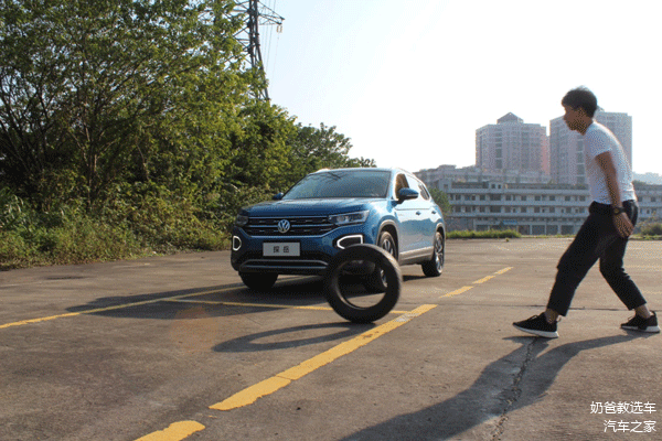 由此我们猜测,大众探岳这个主动刹车的触发机制会不会是:当即将碰撞物体的面积覆盖两个以上雷达探头,或者快速通过两个以上雷达探头才起效。于是就用滚动的轮胎来做测试,结果真的如我们所想的,主动刹车功能起效了。