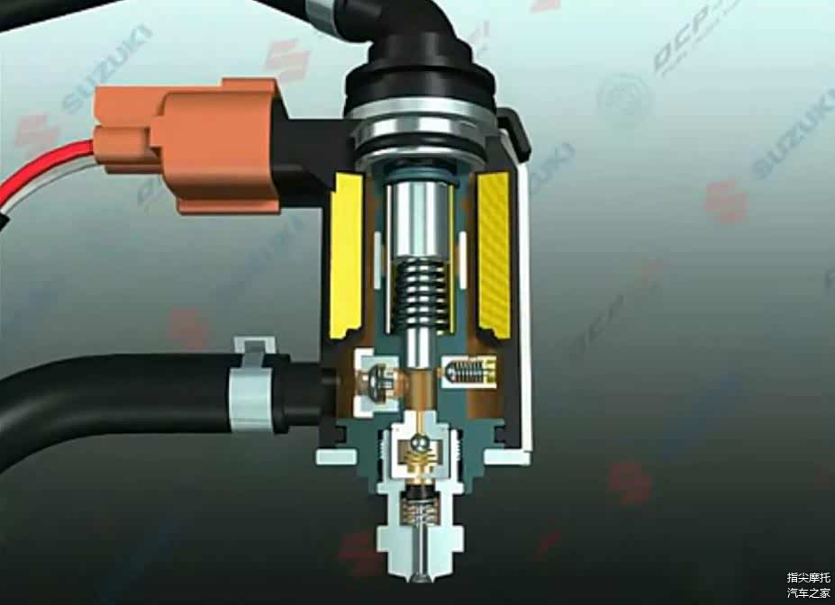 根据ECU的指令喷油器被通电,同时针阀打开,向发动机的进气道喷射一定量的燃油。