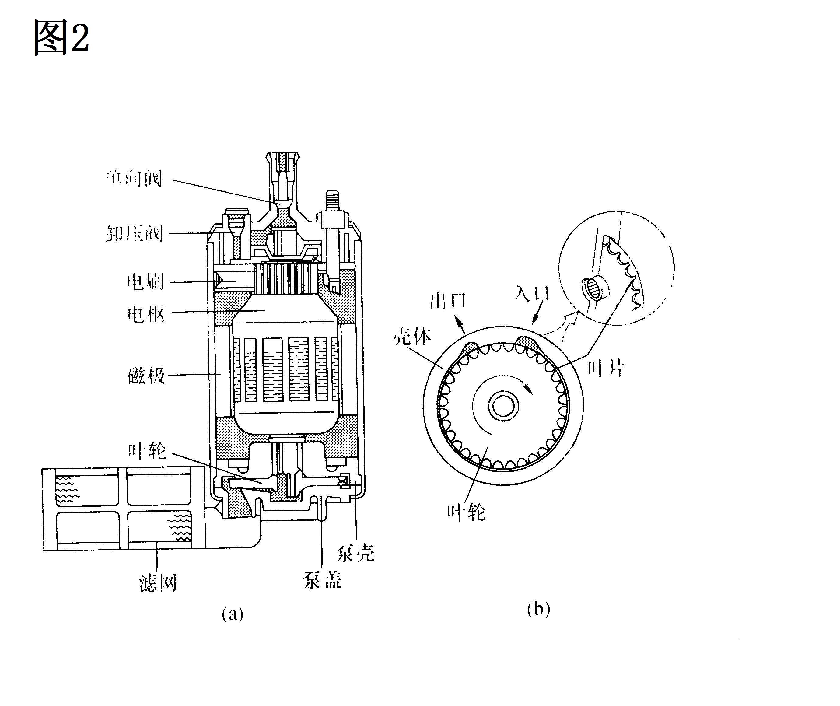 汽油泵工作时,永磁直流电机带动偏心转子转动,其转子、叶片、泵壳所构成的容积周期性地增加和减小,使汽油泵将汽油从进油口经滤筛吸入泵腔内。