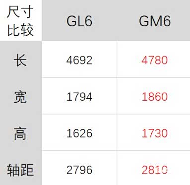 从外型尺寸及轴距上看,GM6比GL6整体稍大了一圈,宽6厘米,长9厘米,高10厘米,轴距也长了一点。仅从这些硬指标上看,GM6确实比GL6大气些。