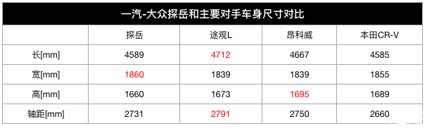 官方定位里,探岳是中型SUV,和上汽大众的途观L一个级别。通过尺寸、动力对比,探岳准确的定位应该是入门级五座中型SUV。它的竞争对手不仅覆盖了入门级中型SUV的途观L 、昂科威以及探界者,也包括主流紧凑型SUV,像CR-V、奇骏和RAV4等,因为这些车空间、动力都同属一个级别。
