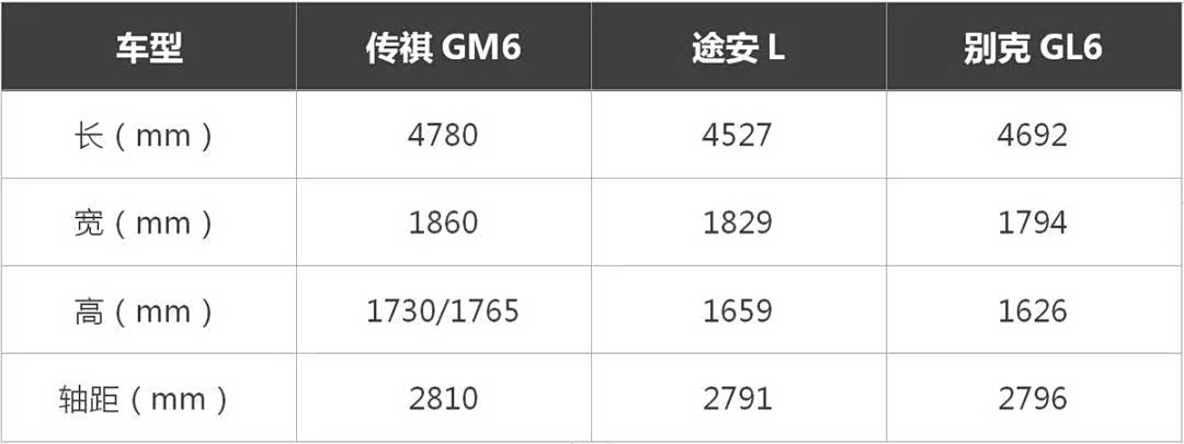 从尺寸上比较,三车放到一起,传祺GM6的尺寸足足大一圈。长度最短的是途安L,但宽度和高度上,途安L都超过别克GL6。