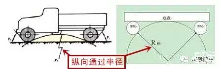 纵向通过半径(R纵):是汽车前后车轮外圆与汽车中部最低点相切的圆弧半径,就是如图所示的圆弧的R纵。