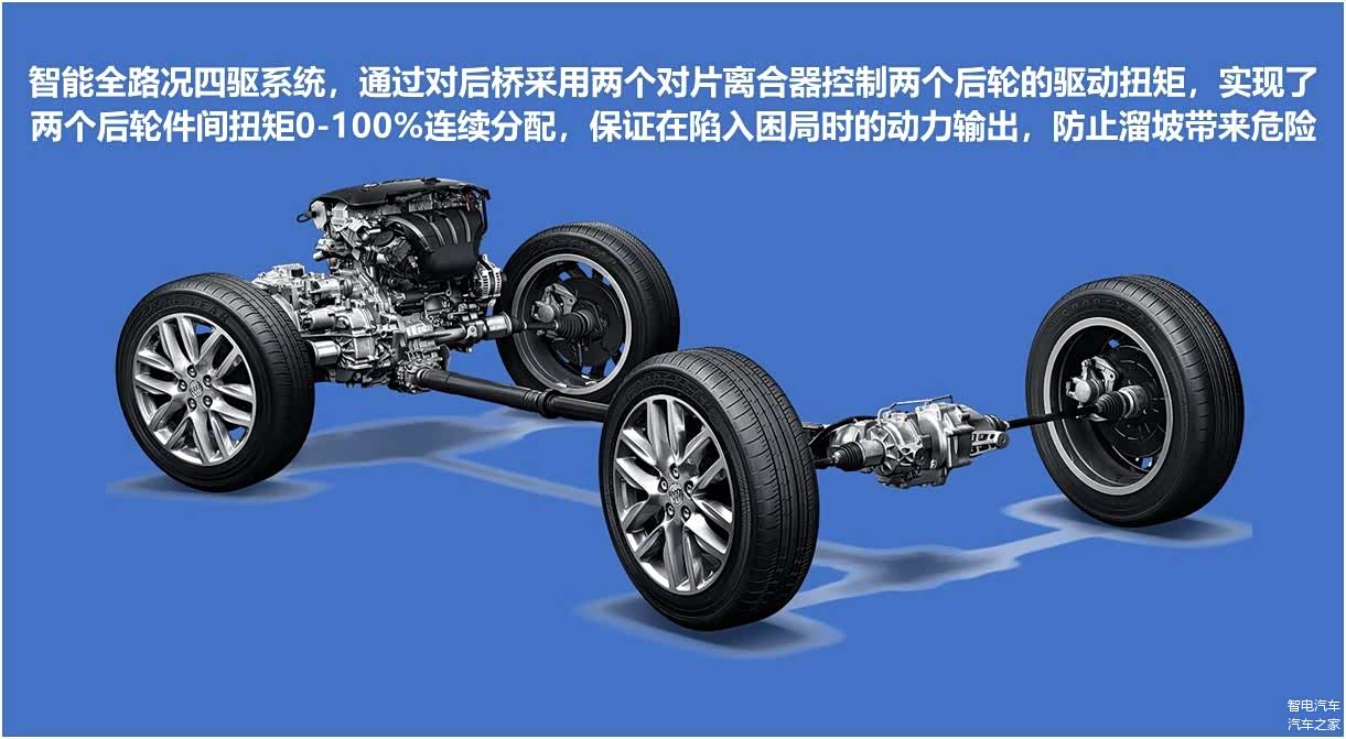 当然,昂科威最引以为傲的不是这套强劲的动力系统,而是它搭载的智能全路况四驱系统。与此前车型搭载的智能四驱系统不同的是,该系统取消了开放式后差速器,改为两个多片离合器,分别控制后方两侧车轮,并且还实现了后侧车轮间扭矩0-100%连续分配,提升了驾驶操控性和脱困能力。
