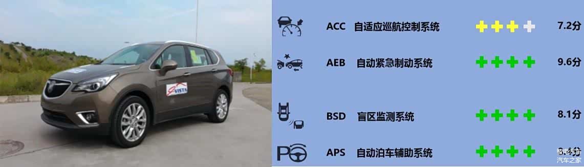 而这其中,别克昂科威的成绩在同批次测试的车型中倒是成绩显赫。其中AEB、BSD、APS三项测试分别拿到9.6分、8.1分、8.4分,均获得优秀成绩,ACC稍逊,但也拿到了7.2分的成绩。