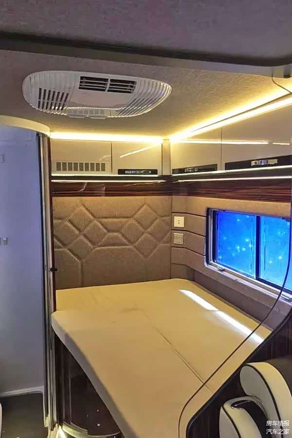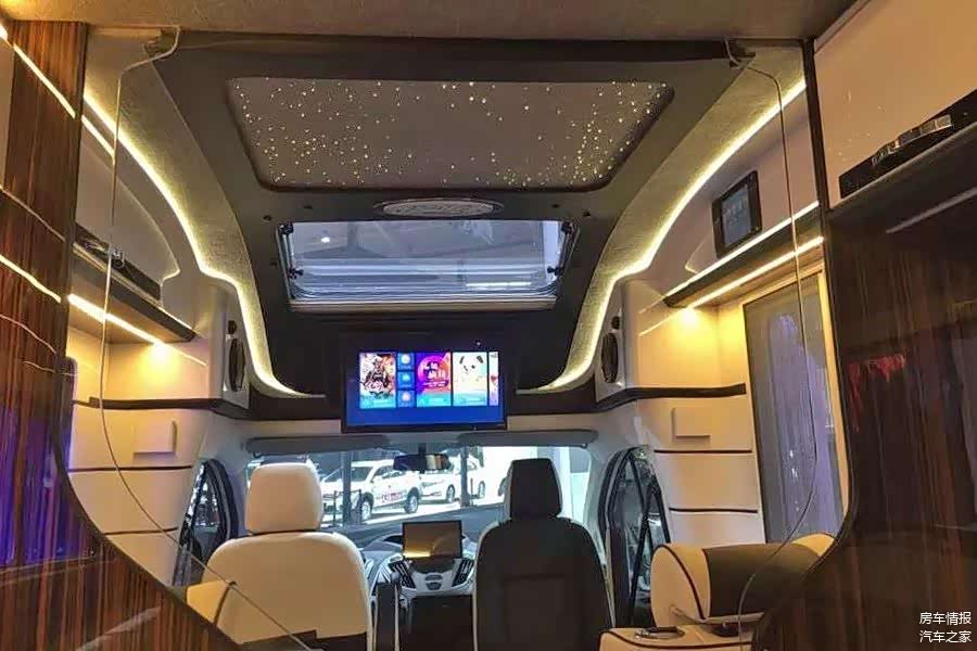 车顶上方是全景天窗,增加了车厢内部的通透感,同时还配有星空灯装饰,美观度还是不错的。驾驶室上方还有一台可翻折液晶电视,不使用时可以向上收起,不占用车内空间,同时配备DVD音响系统,行车途中也能观看电视节目。