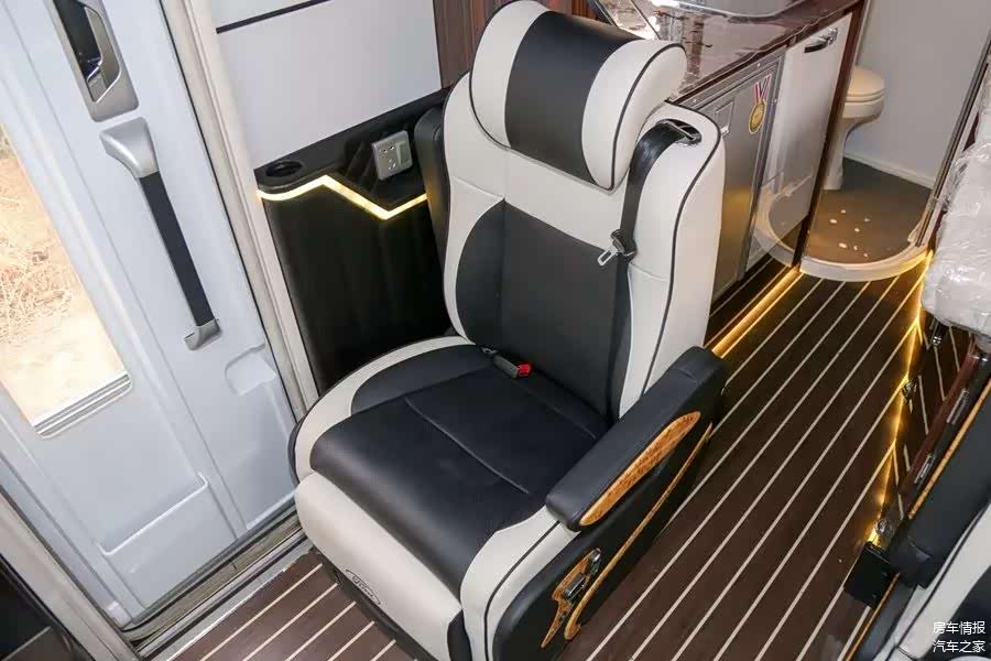 驾驶室与会客区相通,主副驾驶座椅为电动调节,均采用真皮打孔材质,乘坐舒适,驻车以后可360°旋转,与后方商务沙发座椅形成会客区域,说实话在C型房车上这种设计并不常见,驾驶过程中虽然只能乘坐4人,但是空间宽敞,舒适度大大提升,档次感也很高。车内采用免维护游艇地板革,防滑、耐磨。
