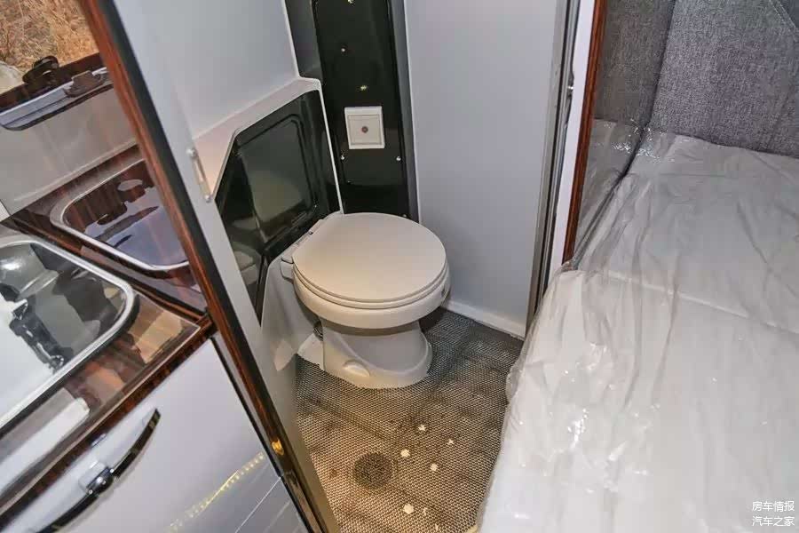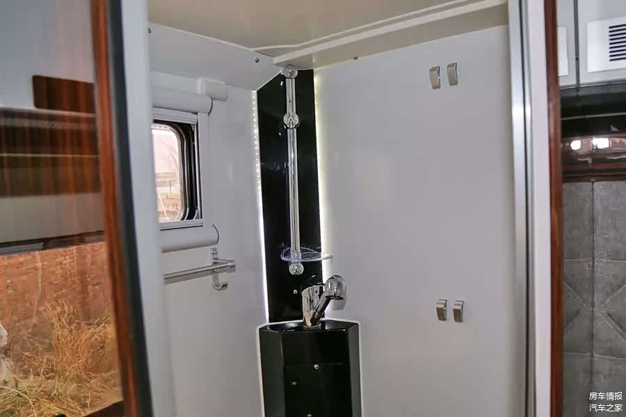 卫生间采用推拉门节约车内空间,内部配有洗手台、淋浴、电动马桶、梳妆镜、毛巾架等设施。
