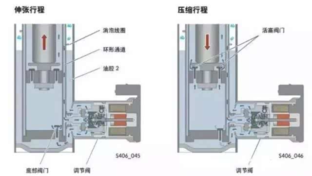 另外,具有双向阻尼的减震器(即在压缩时和反弹时都有阻尼效果)一般需要压缩阻尼小于回弹阻尼,压缩过程主要发挥弹簧缓冲的作用,回弹时再抑制振动。