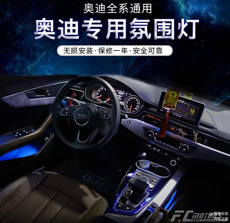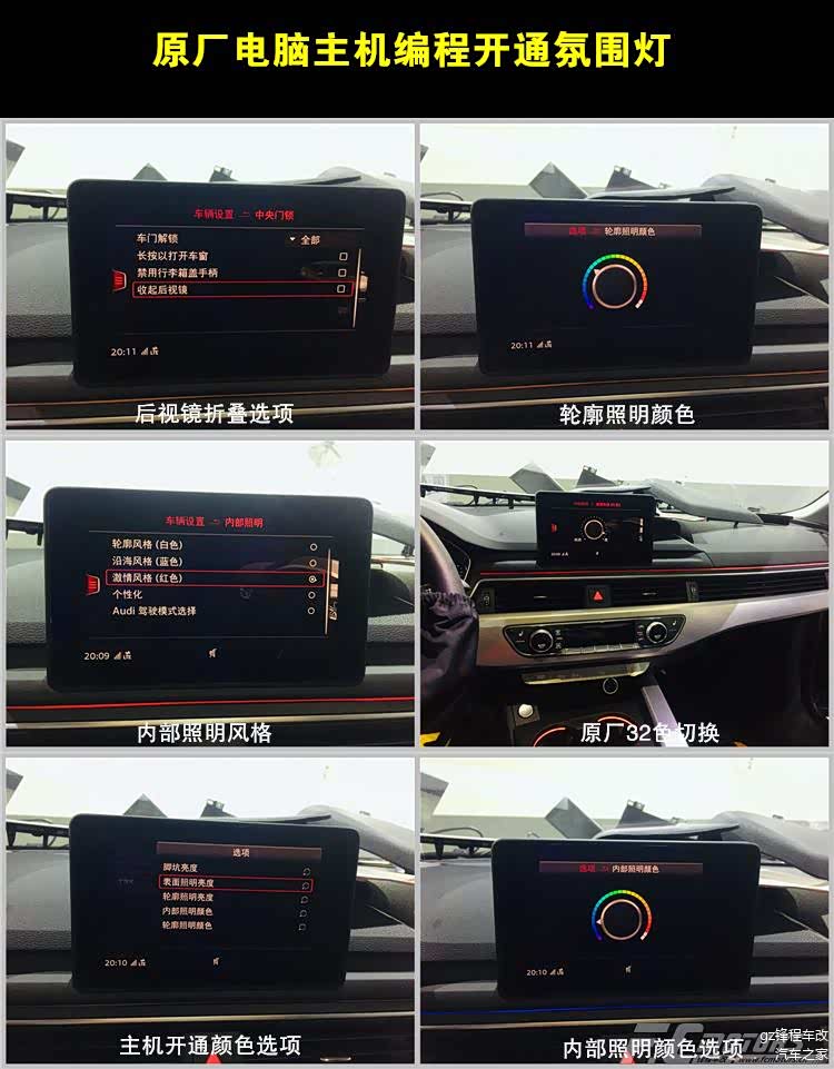 改装配置:奥迪A5专用32色氛围灯、后视镜折叠、倒车影像