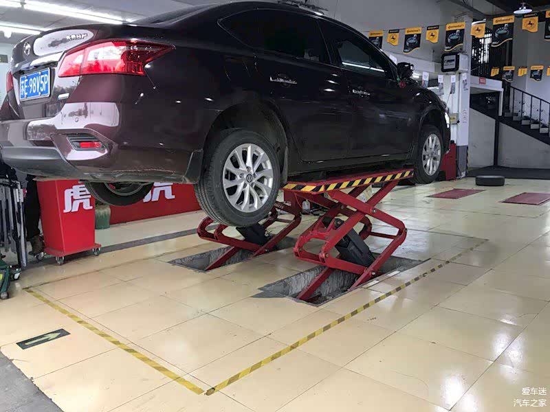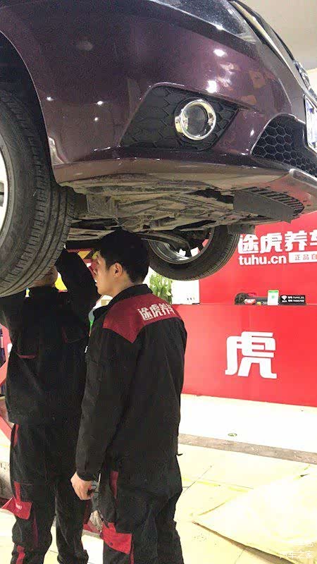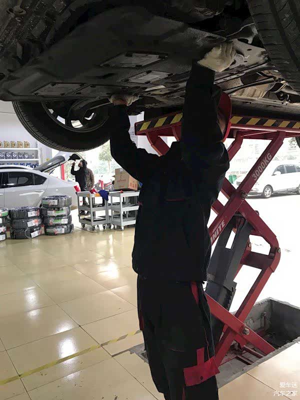 到了途虎门店后有工作人员迎上来,简单交流后就把钥匙给了师傅,,师傅把车开到指定工位,按照流程对整车进行初步体检,确认ok了之后就把车升起来准备安装。可以明显看到车底已经有一层污泥了,发动机那一块也未能幸免,仔细观察有些地方已经留下了细小的刮痕。