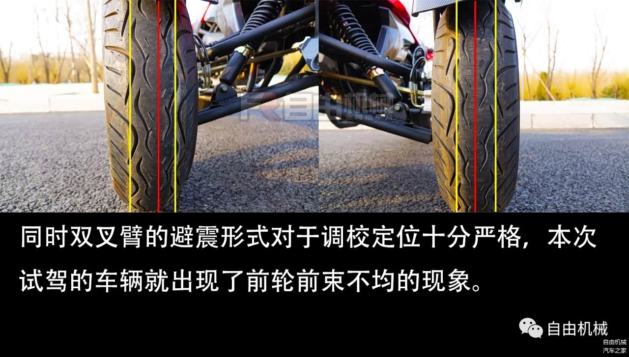 前面提到了,双叉臂的结构需要对前轮前束、内倾角等进行十分精准的调校,否则很容易出现异常问题。本次贱贱借到的试驾车右前轮前束的调校就出现了问题,在速度提上来之后,车辆会一直左右跑偏,造成整个车辆的行驶轨迹很难掌控,并且会引发上半身重心的来回晃动。所以此类车型的车主在日常使用时要非常重视车辆的所有细节,发现问题及时寻找专业人员进行调校恢复。