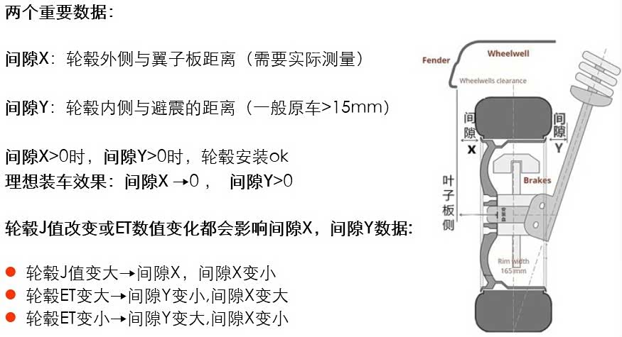 首先轮毂理想的装车效果是安装后与翼子板(轮眉)齐平,此时轮毂的装车视角效果上是饱满的。其次再来看两个重要的装车数据,间隙X / 间隙 Y :