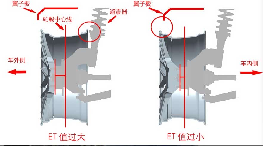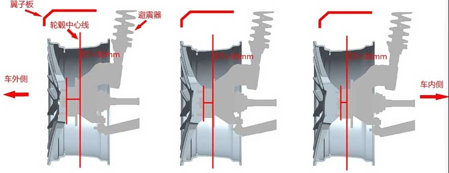 在实际装车过程中,ET值一直是我们改装师傅注重的点,若是轮毂ET值过大了,轮毂容易与避震器发生刮蹭,若是ET值过小,在轮毂装车时很容易凸出车身与翼子板发生刮蹭。