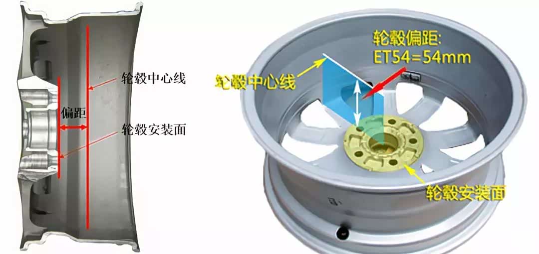 偏距又可以叫做offset或者ET,是只轮毂中心线到轮毂安装面的距离,单位为mm。