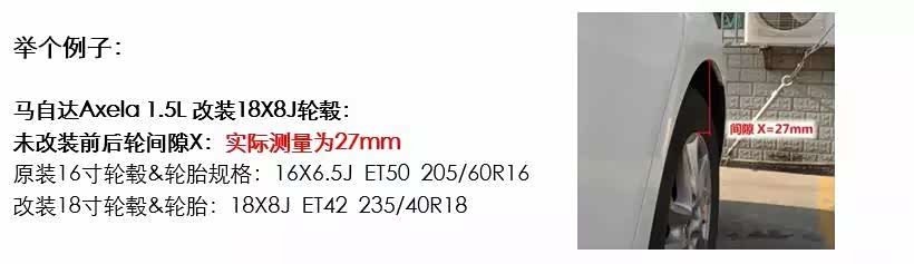 间隙X变小:(改装轮毂J值-原装轮毂J值)/2*25.44mm+(原装轮毂ET-改装轮毂ET)=(8-6.5)/2*25.4+(50-42)=27.05mm。此时轮毂向车身外侧凸出27.05mm(由于未改装前的间隙X实测为27mm)所以AXELA改装18寸轮毂与翼子板齐平。