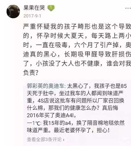 奥迪Q5车主:奥迪汽车车内黑心棉导致胎儿畸形流产,孕妇肝损伤