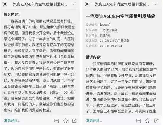 奥迪A6车主称因车内空气质量差导致自己得肺癌