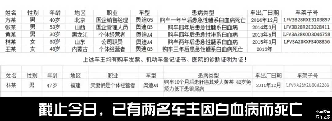 3、2019年3月,6名奥迪车主实名举报异味奥迪车致车主患白血病等癌症,其中两人已因病去世。