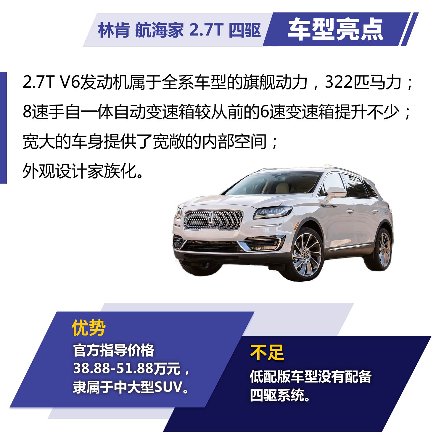 航海家是一辆带有浓重美式色彩的SUV,对它来说,除去林肯品牌最看重的舒适度以及豪华调性外,它似乎不太注重对于性能、甚至是内饰装潢方面的诉求。但是即便是这样,航海家的综合表现也符合一辆豪华品牌SUV应有的素质。中配车型40余万元的售价直接将竞争对手锁定在豪华中型SUV,但是相比之下,它拥有更大的体格,这样的性价比还算不错。