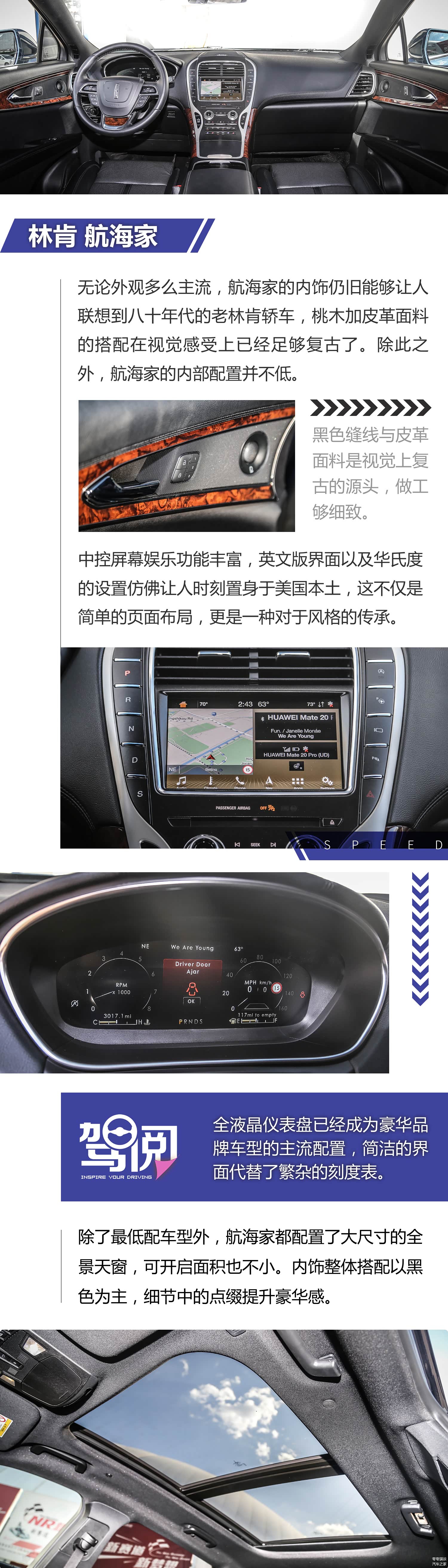 内饰方面,林肯航海家提供了比较复古的视觉感受,整体风格像是一台八十年代的老林肯轿车,既拥有了诸多豪华配置,同时保留了自己的所谓的“个性”。这种内饰风格不会讨喜所有人,但是如果你对传统的美式豪华情有独钟,那么航海家正对你的口味。