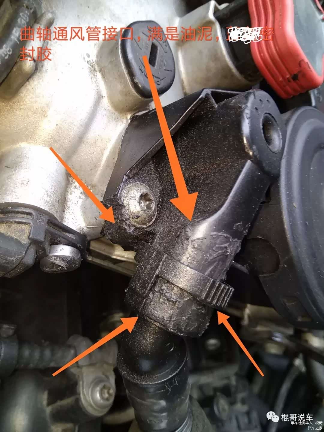 曲轴箱通风管,高压线圈插头,机油加注口,都是一坨一坨的密封胶,反反复复的不知道拆过多少次,插头接口的位置估计也严重磨损