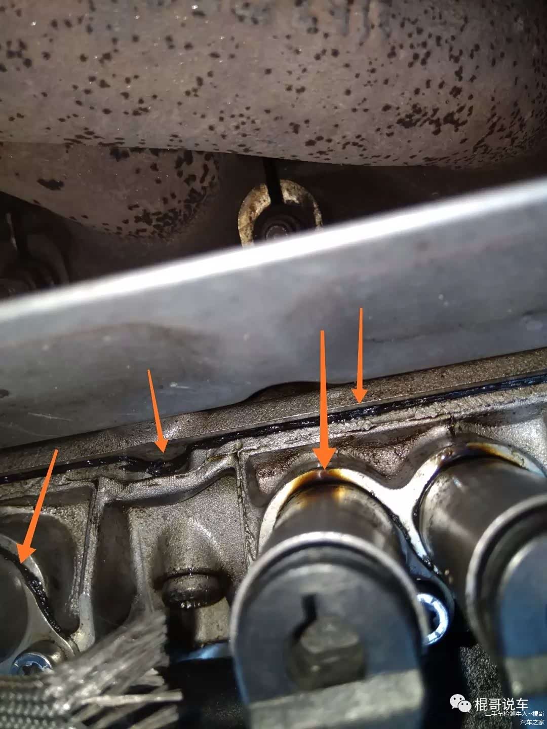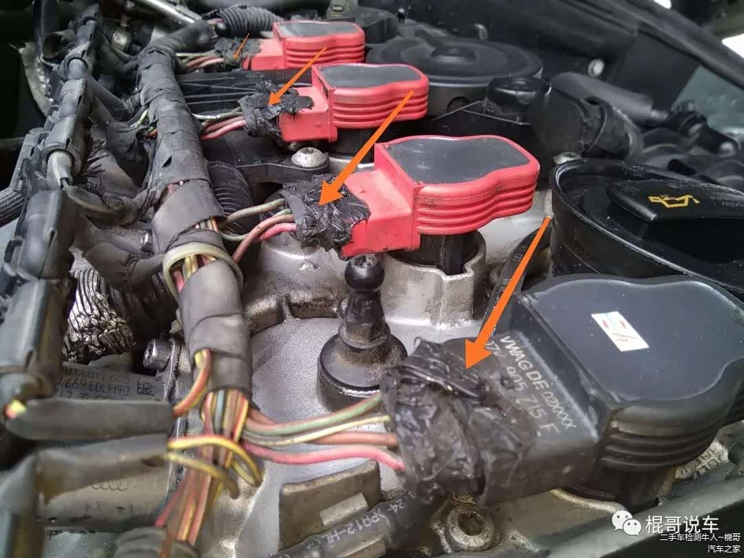 最后我迫不及待的把发动机上面的装饰罩拿开,发现里面更是不堪入目,连高压点火线圈的颜色都不一致,各种各样的渗各种各样的漏,气门室盖垫漏油、正时链条盖连接处漏油、高压油泵密封圈漏油甚至连油气分离器都在漏油……