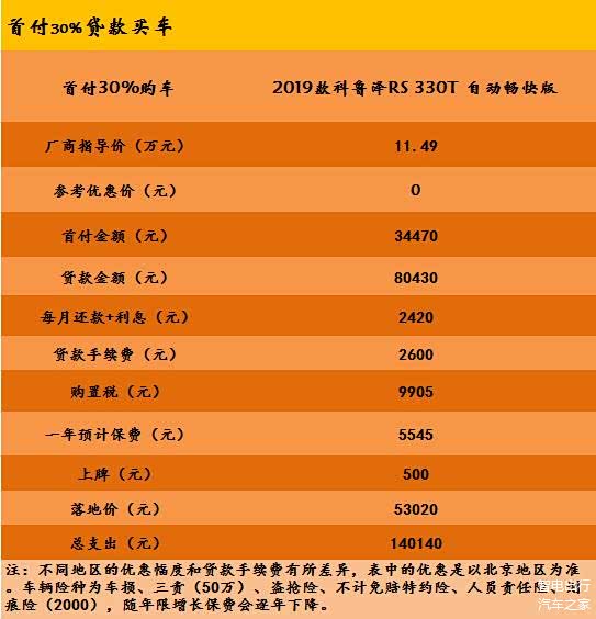 科鲁泽搭载1.0T和1.3T两种动力,相比之下,1.3T的动力更加能够满足人们的用车需求,所以1.3T车型应该是更合适的选择。而在1.3T车型中性价比较高的当数2019款科鲁泽RS 330T 自动畅快版,这款车售价11.49万,之所以选它,是因为该款车在配置上只比2019款科鲁泽RS 330T自动痛快版的车型少了一项座椅加热功能但价格却便宜了5000元。下面就来看看至少需要多少钱才能把这款车开回家。