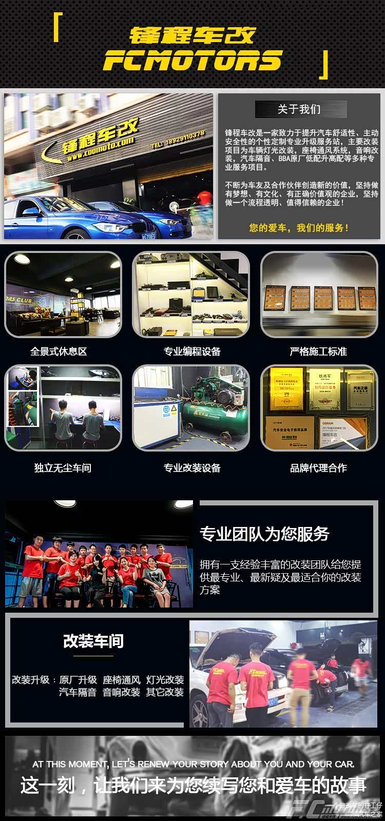 锋程车改(FCFS)汽车服务连锁机构, 成立于2013年5月,总部坐落在东莞虎门,以为客户创造更大的价值、追求长远发展为企业立身之本,系一家集汽车灯光改装、座椅通风、音响隔音、漆面保护膜、车身改色膜、外观改装、原厂配置升级改装的高端汽车服务企业。