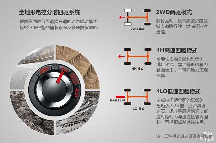 在同价位硬派SUV中长的好看这是它的表面功夫,接下来该秀秀肌肉了。 途达(图片 | 参数 | 询价)的四驱底子非常好,比如非承载式的车身,这是衡量是不是硬派越野的准入门槛,悬架上前双叉臂、后整体桥,怎么样,这里及格了。然后是加分项,全地形分时四驱和后桥差速器锁止都是亮点配置,所以这些是20多万硬派越野途达的优势。
