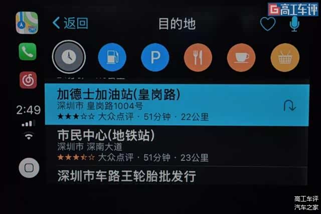 按下旋钮会弹出菜单栏,点击搜索按钮会出现历史地点和目的地推荐页面。