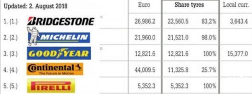 作为汽车的重要部件,轮胎的重要性不言而喻,它不仅支撑车辆行驶,而且还影响行车质感,一条好轮胎,能有效降低噪音,提高乘坐舒适性和行车稳定性,更重要的是,在面临潜在的爆胎风险时,品牌轮胎的安全性无疑更高。为了给车主提供有益指导,下面就通过外媒发布的五大轮胎品牌(以2018年的销售营收为依据),来看看全球最好的轮胎品牌都有哪些,你的爱车有没有使用这些轮胎?
