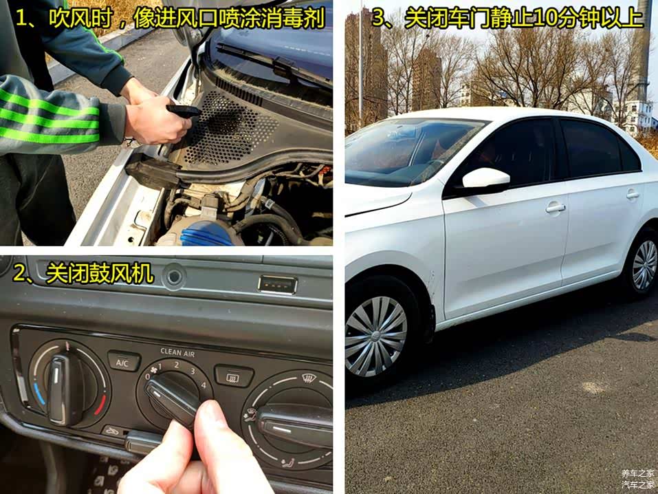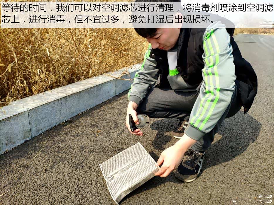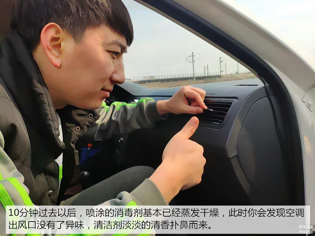 关闭车门大约10分钟以后,我们的消毒工作就完成了。其实酒精的添加比例还可以加大,一般在30%以内都不会出现什么安全问题。完成以后,我们查看出风口灰尘消除情况,此时你会闻到淡淡的清洁剂香味。