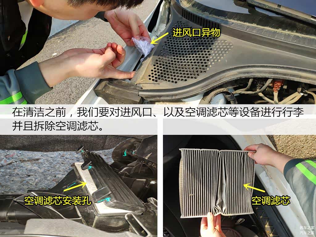 1、清理空调进风口的异物,主要是枯叶、灰尘等。避免下一步骤被吸入车内。