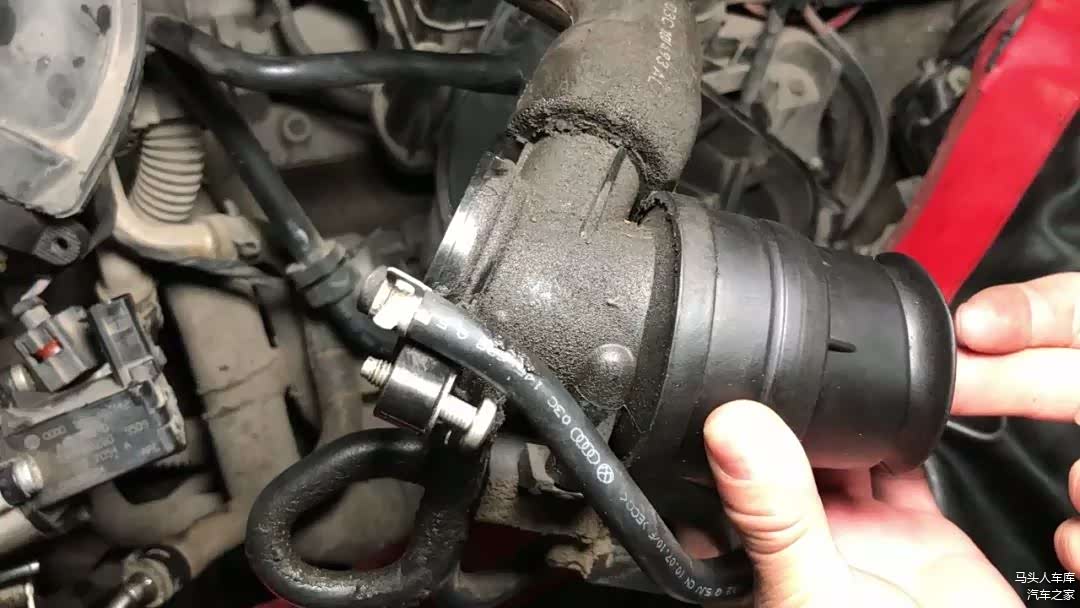 这个塑料管是连接什么的呢?它是一个三通管,也就是说主要有三个通道,分别连接着涡轮进气口、进气道和曲轴箱强制通风管。其作用就是将来自车外的新鲜空气和通风管送来的曲轴箱废气输送到涡轮,然后混合器经过涡轮加压供往发动机气缸内进行燃烧。而漏油的地方就是这个三通管和涡轮进气口的接缝处。