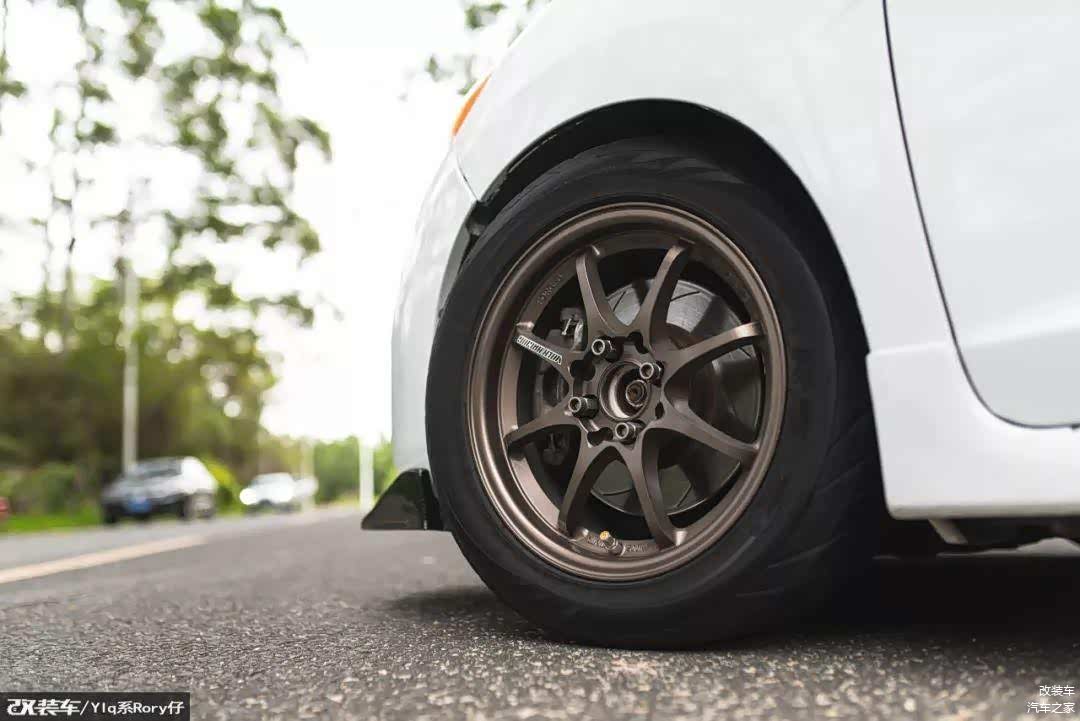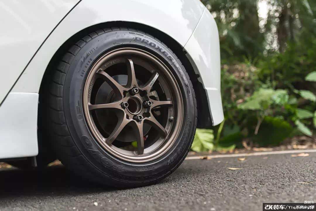 车虽然是改得非常不错,但这套山寨的CE28轮毂就让人觉得有点美中不足了,轮胎车主采用了前后不同尺寸的搭配,前轮使用飞德勒595RSRR 205 50 15,后轮是东洋R1R 195 55 15,车主说是因为看了一个日本的跑山节目后,所以学习里面尝试使用这个尺寸搭配,不过没有实测有没有作用还真不知道。