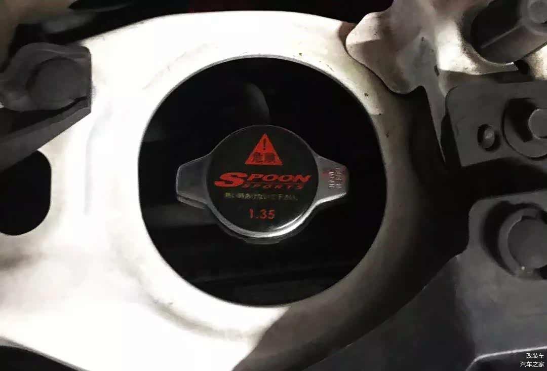 当车子的动力提升了,散热系统也必须要跟上才行,特别是车主用上了8000转程序,所以车主更换了低温水胆可以让水箱提早在68度开始运作,而Spoon水箱盖增加了水箱运作的压力,最后在加上一个7排油冷,更加有效地帮助发动机降温。