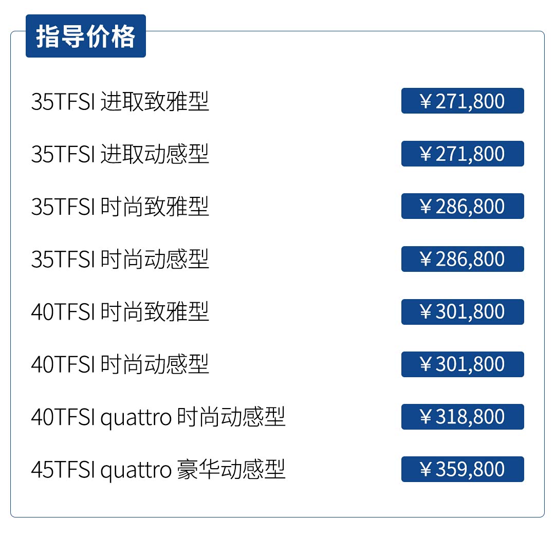 高配车型40TFSI quattro时尚动感型和45TFSI quattro豪华动感型还配备了quattro四轮驱动系统。让车辆拥有更好的牵引力、稳定性和动态表现,驾驶更灵活、更安全。