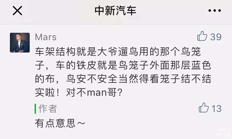 说到这里,Man哥想起一条粉丝留言,觉得有点意思:车架结构就是大爷遛鸟用的那个鸟笼子,车的铁皮就是鸟笼子外面那层蓝色的布,鸟安不安全当然得看笼子结不结实啦!