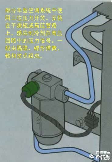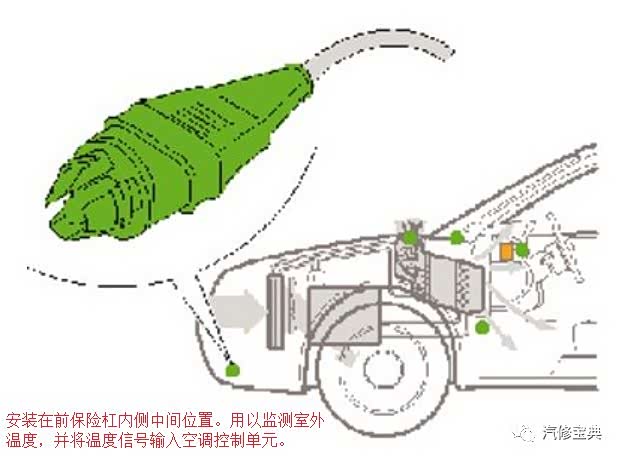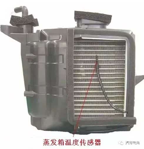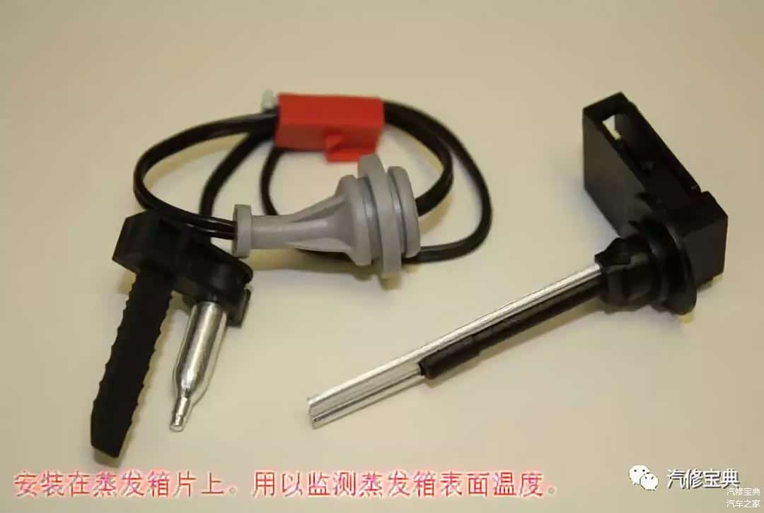 安装在蒸发箱壳体侧面。其感温头处于蒸发箱散热片中,感温头内封装制冷剂,同时有一毛细管通向感温包。通过感温包的热胀冷缩控制其触点的开关与闭合,进而控制压缩机的结合或断开,防止蒸发箱结霜。正常情况下,该传感器电阻/电压随温度的升高而逐渐减小。