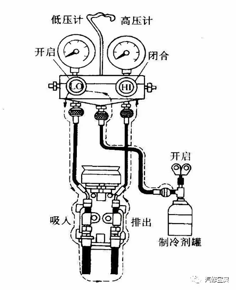 注:从高压侧注入制冷剂时,发动机需处于非工作状态,且手动低压阀不得打开,以防产生液压冲击。