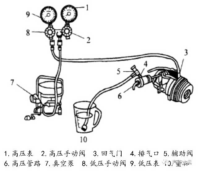 先将系统抽真空,准备冷媒油(需比标准量多一些)到带有刻度的量杯中。利用真空吸力将准备好的冷媒油由高压侧检修阀端吸入。加注完成后应对系统继续抽真空,以便排除随加注冷媒油过程中进入系统的空气。