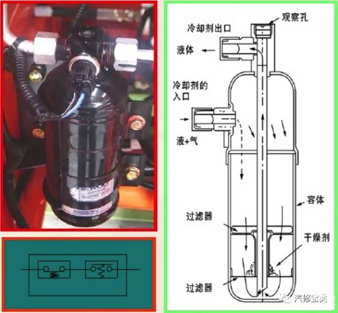 现象三、看到间断而微量气泡,高低压两侧温差较小,以上现象说明制冷剂储量不足,要检查空调系统是否存在泄露之处,并补足制冷剂。