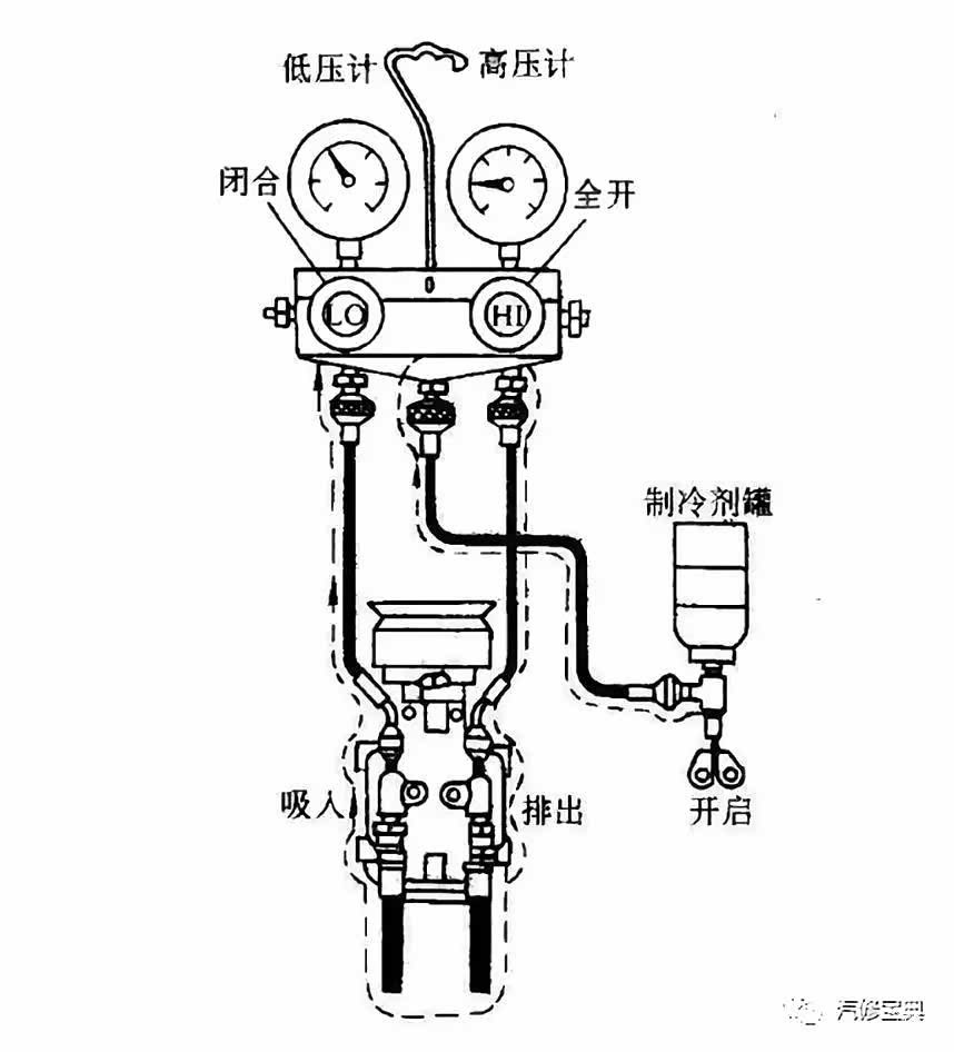 d.从高压侧注入规定量的液态制冷剂。最后关闭制冷剂罐注入阀及空调压力表上的手动高低阀,并卸下空调压力表。